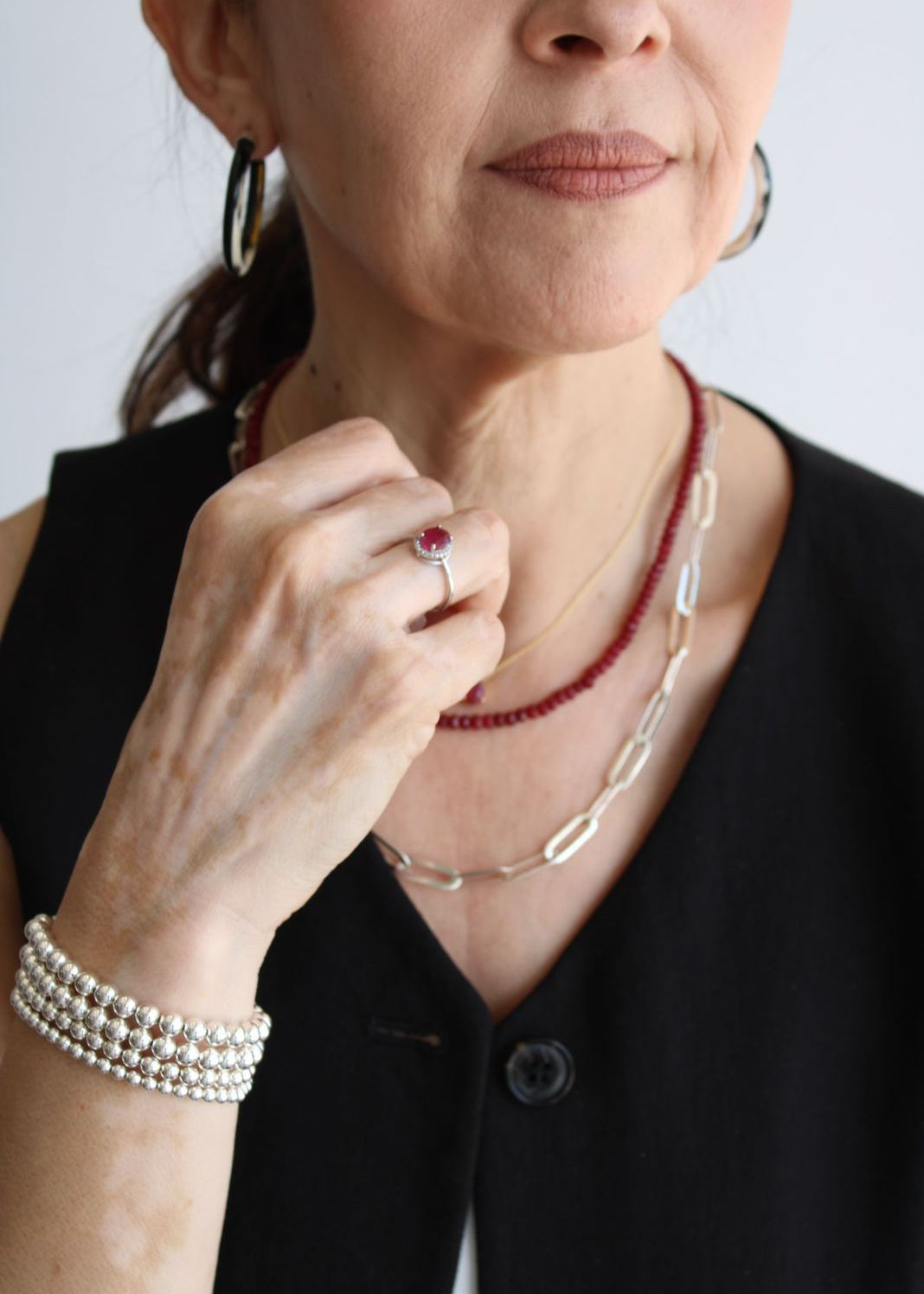 Anillo con rubí natural con halo de topacios blancos montados en plata 925.