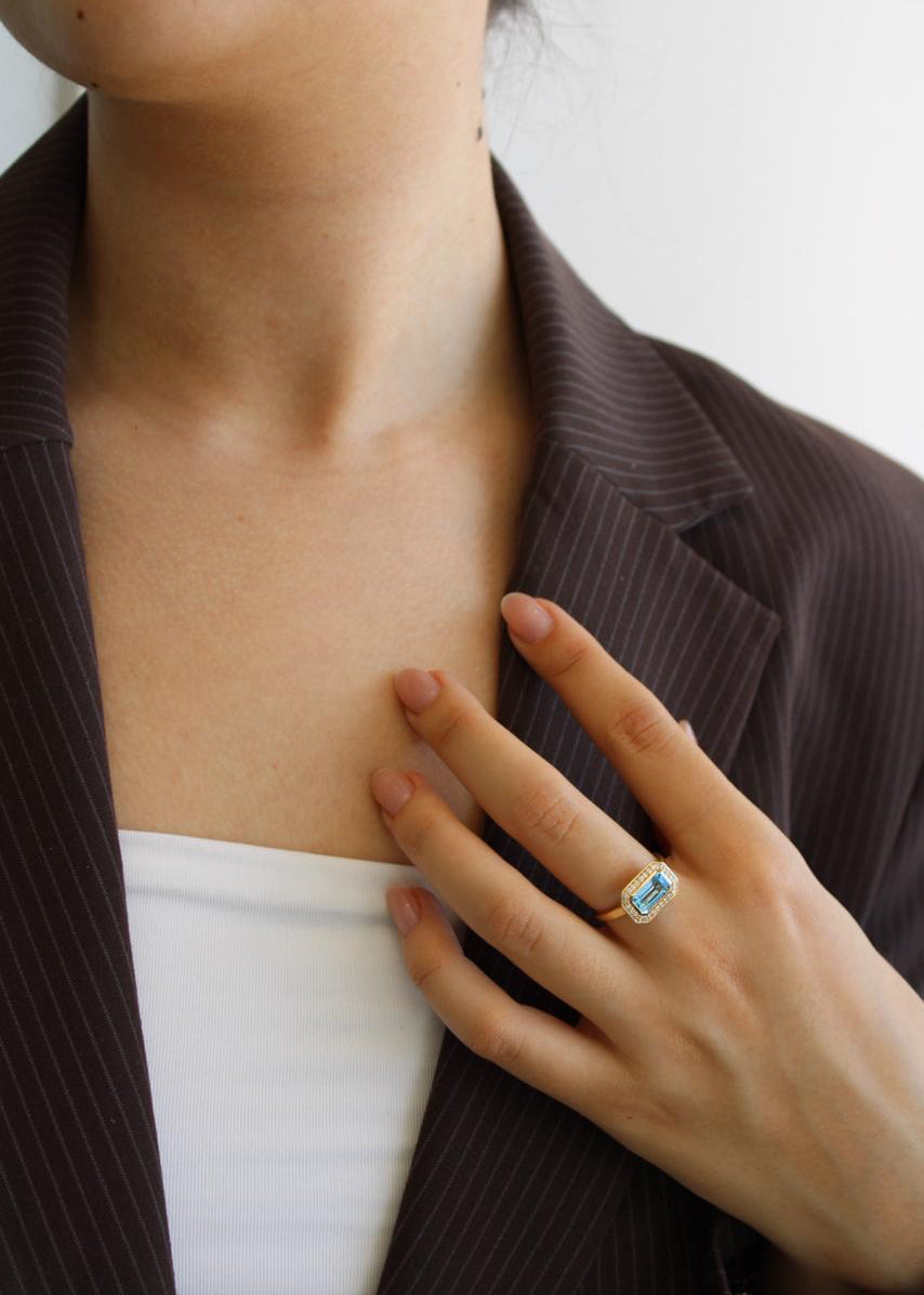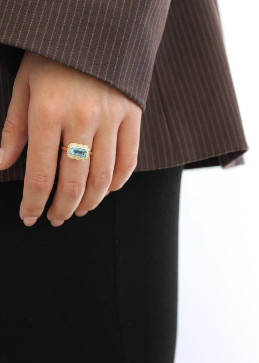 Anillo con diseño de topacios naturales azul y blancos montados en oro amarillo 14k.