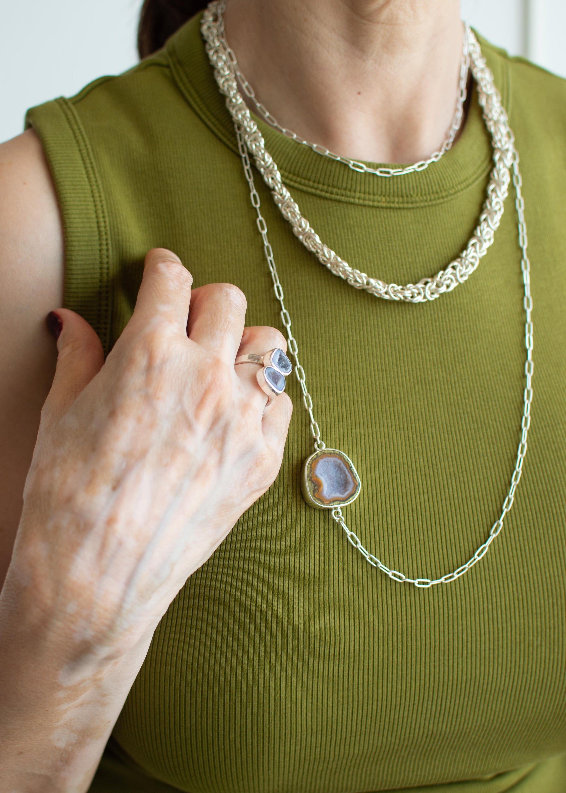 Collar largo con cadena eslabones en plata .925 con detalle de punta de cuerno de venado o geoda.