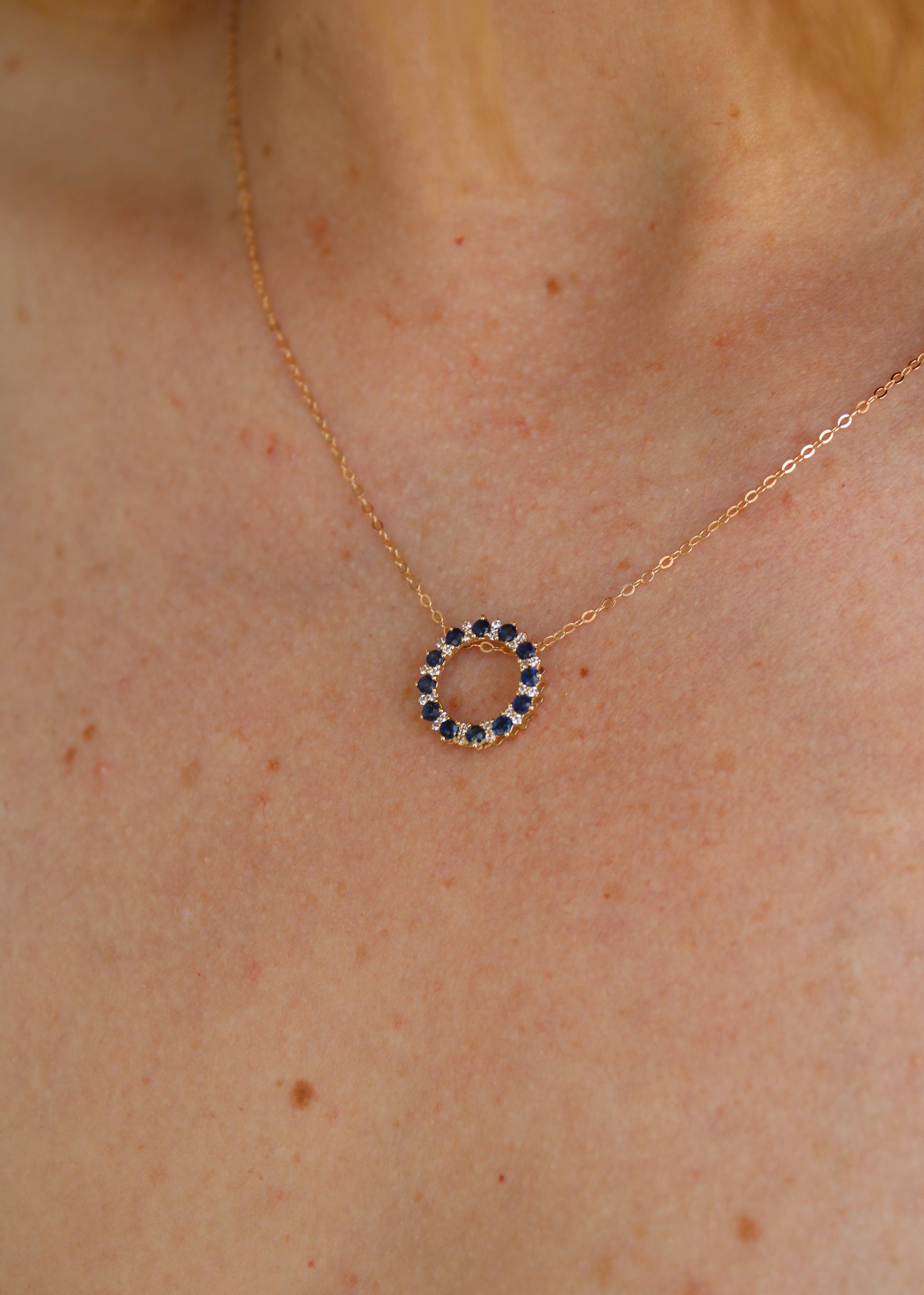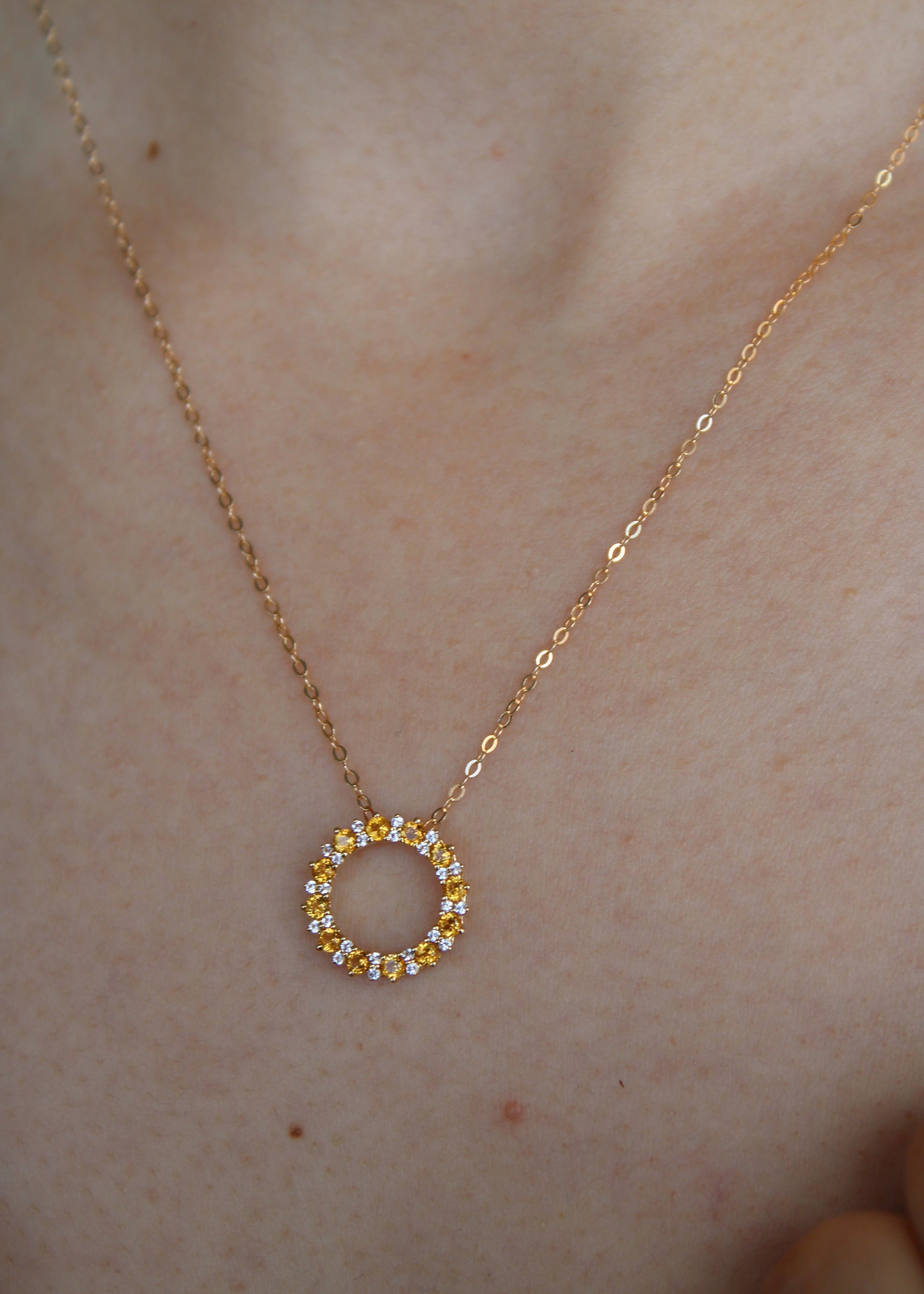 Collar detalle círculo con granate, esmeralda, zafiro o aguamarina natural y topacio montados en oro amarillo 14k.