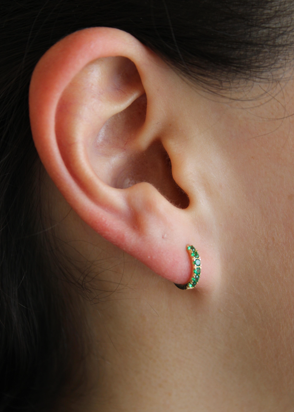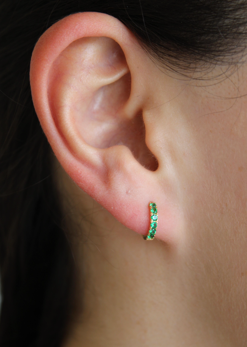 Arracadas mini con detalle de esmeraldas o amatistas naturales montadas en oro amarillo 14k.