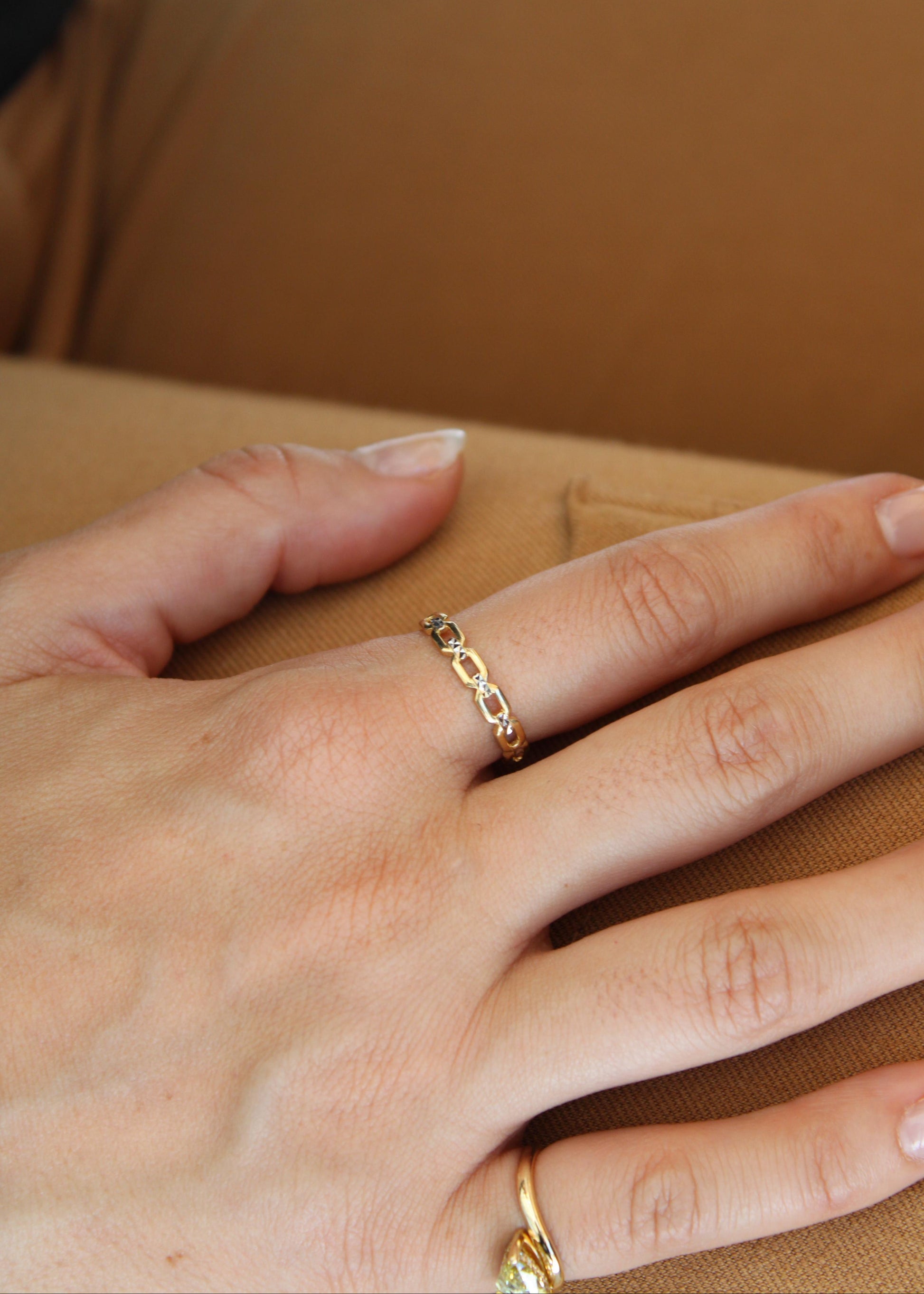 Anillo diseño eslabones en oro amarillo de 14k y con detalle martillado en oro blanco 14k.