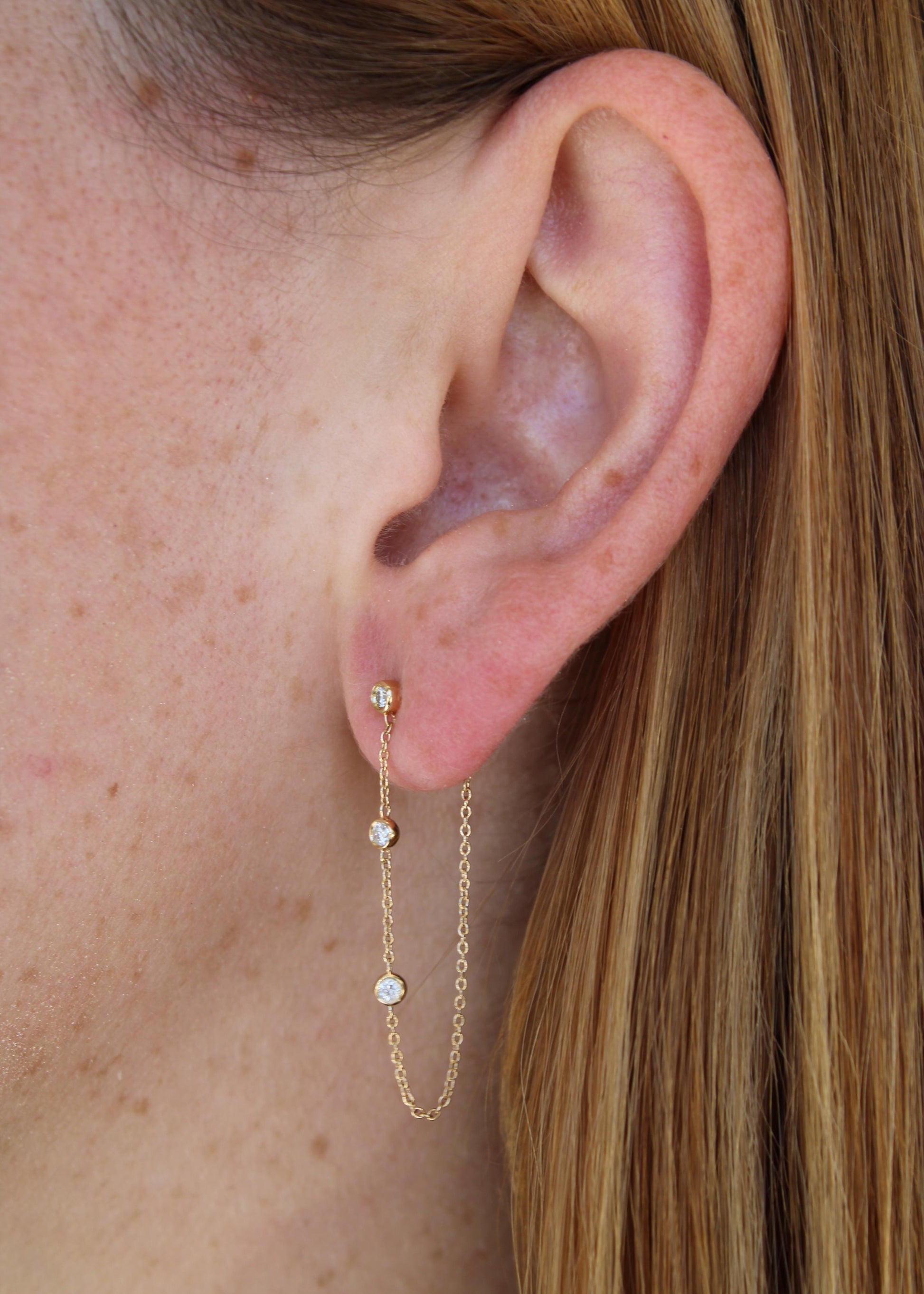 Aretes colgantes en oro de 14k con detalle de 3 pequeños diamantes naturales separados y biselados.