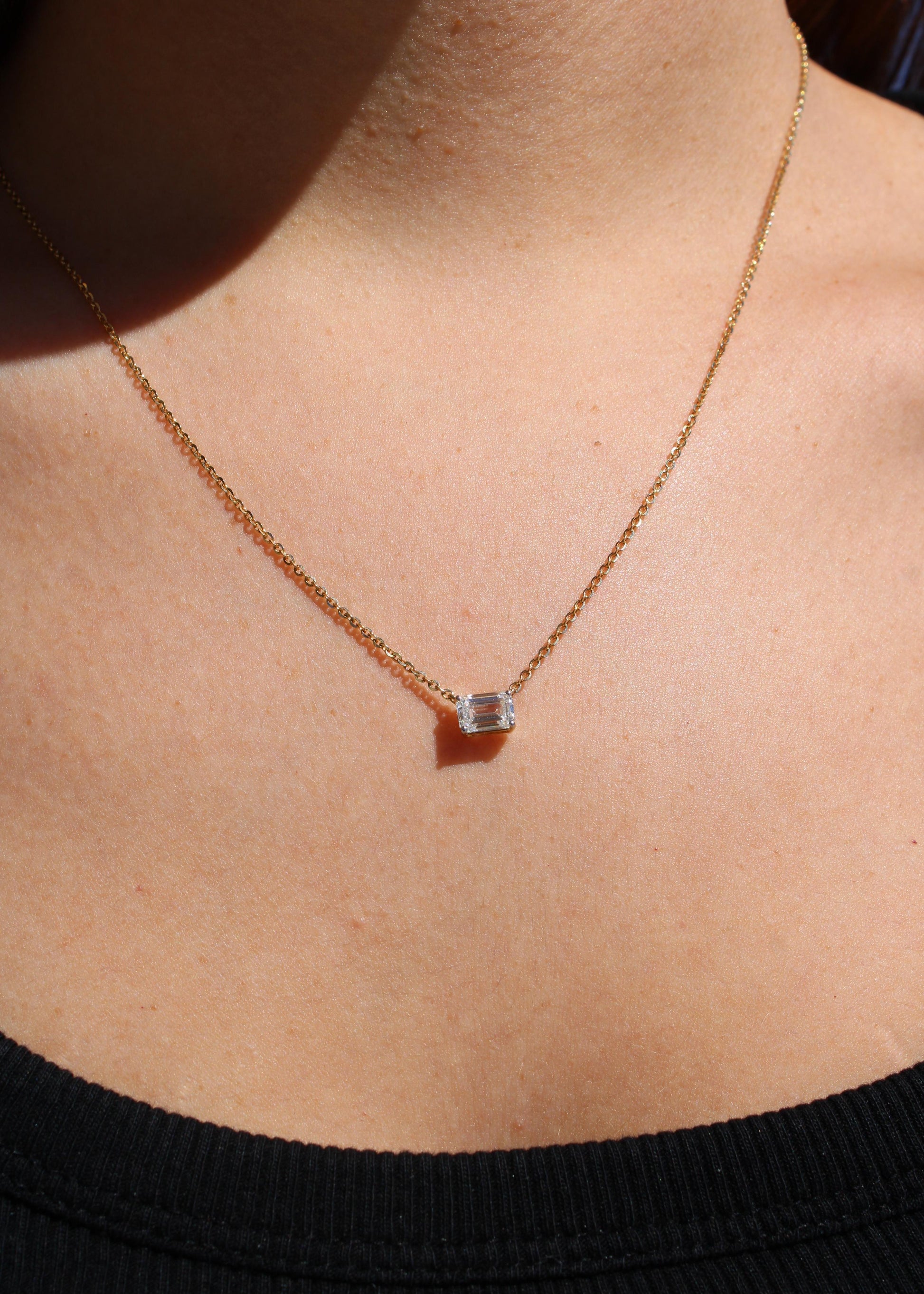 Collar con diamante de laboratorio de 1.00ct en corte esmeralda o redondo con uñas montado en oro amarillo 14k.