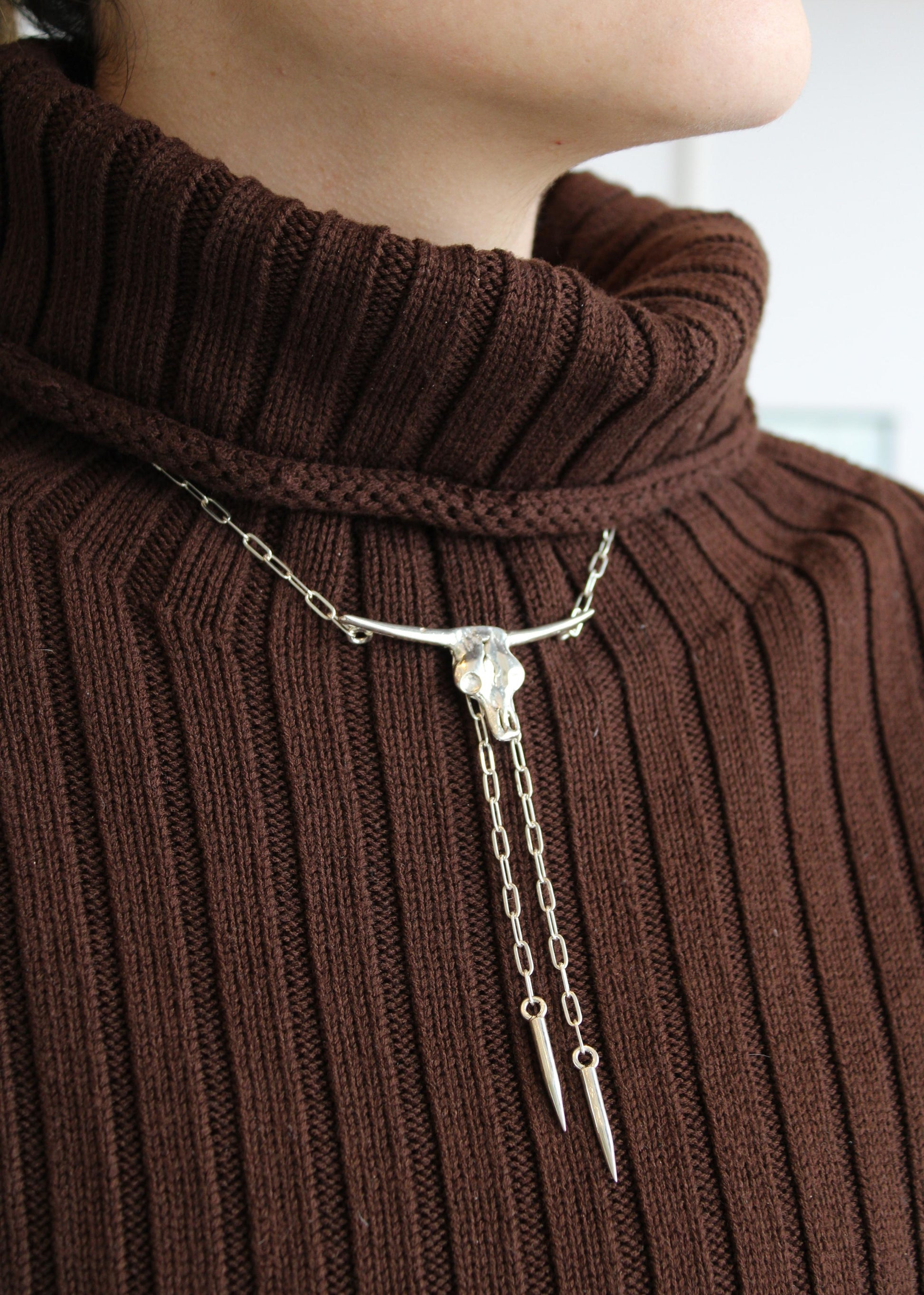 Corbatín con cadena de de 50cm, toro “Long Horn” de plata y cadenas colgantes.