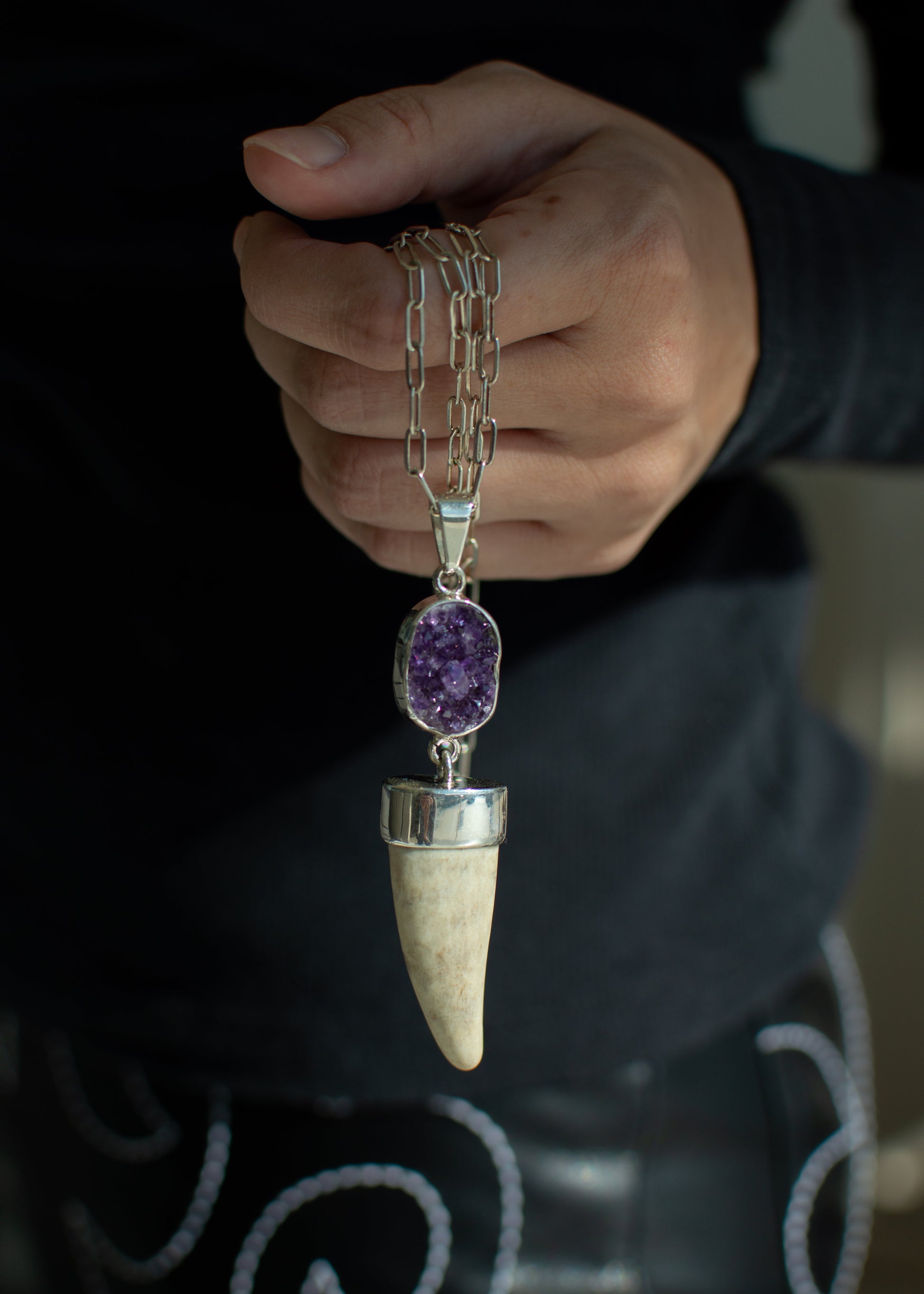 Dije cuerno natural de venado, con piedra amatista en bruto montados en plata .925