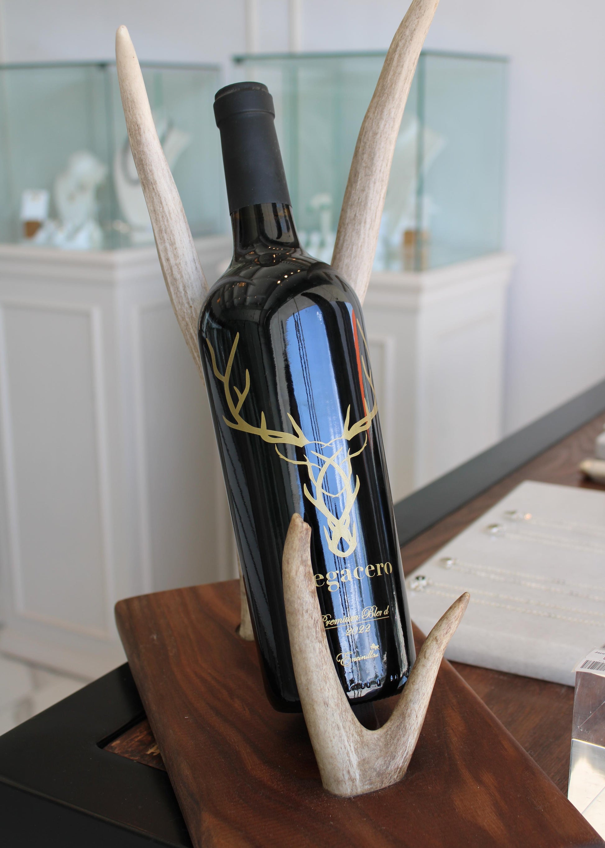 Porta botella hecha de una cornamenta completa de venado, embonados perfectamente para colocar una botella y base de madera.