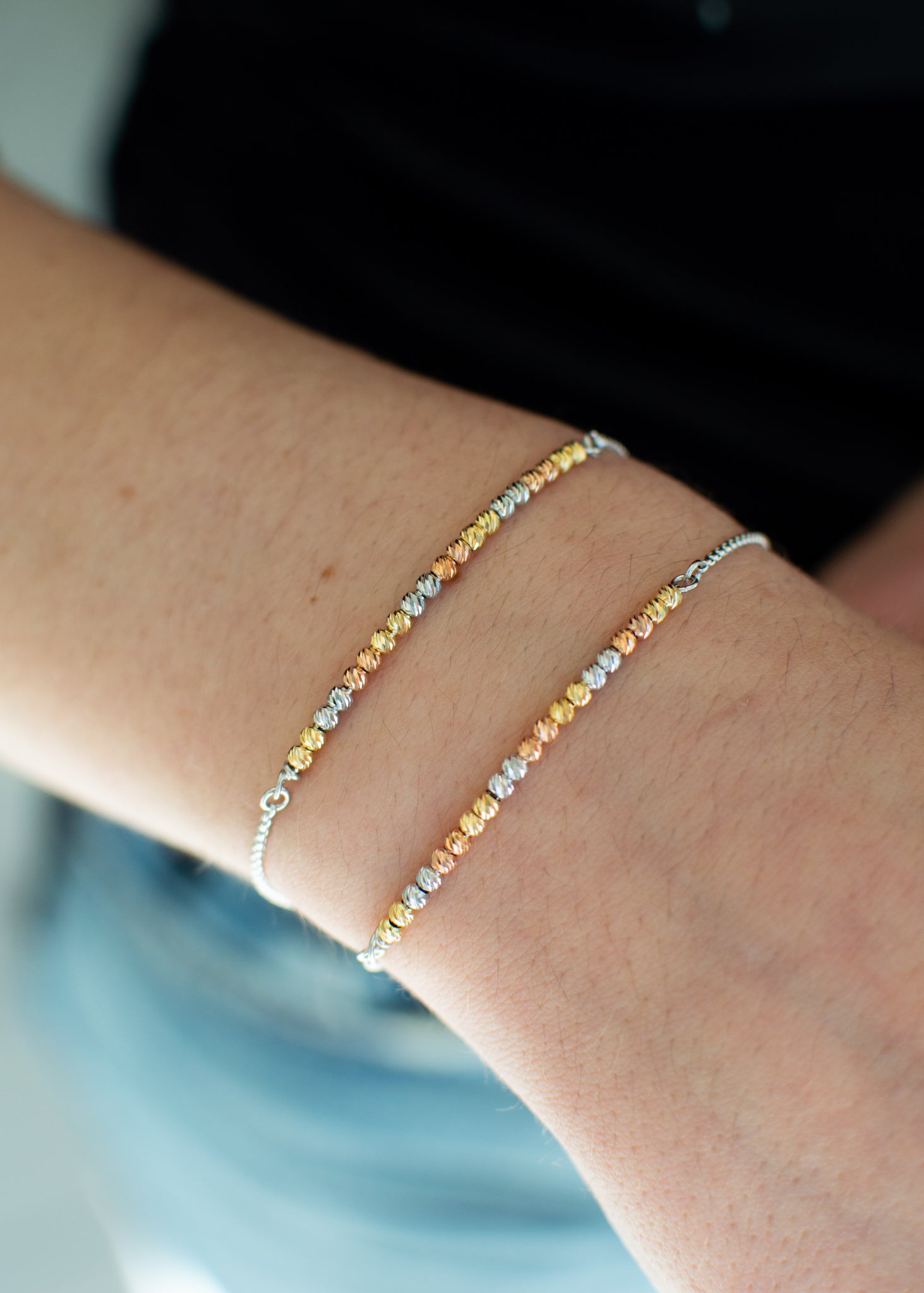 Pulsera ajustable de Plata 925 con bolitas adiamantadas en plata, baño de oro amarillo y baño de oro rosa.